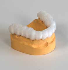Zu den Nachteilen der FFF-Drucker gehört, dass sie relativ langsam sind, dass das Filament von Hand eingeführt werden muss und dass bei vielen Geometrien Stützen notwendig sind. Von Vorteil ist ihr kostengünstiger Einsatz, dass keine Flüssigkeiten im Prozess beherrscht werden müssen und dass farbige Bauteile durch den Einsatz farbigen Baumaterials gedruckt werden können. Beispiele sind die Verbindungselemente des Exoskelettes in Abbildung 6 und die Aufbissschiene in Abbildung 7.
