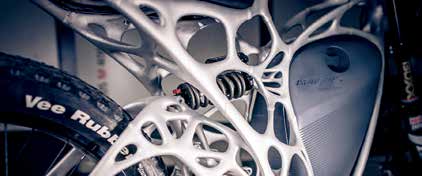 Anstelle von Polyamid-Pulvern können in einem modifizierten, aber grundsätzlich gleichartigen Prozess auch Metallbauteile aus Metallpulver „gesintert“ (physikalisch richtig: „geschmolzen“) werden. Aufgrund der erhöhten Verzugsgefahr werden im Metallprozess Stützen benötigt. Ein Beispiel ist der nach bionischen Prinzipien konstruierte Rahmen des Elektromotorrades in Abbildung 5, der zudem hohl ist. Er wurde aus einem „Scalmalloy“ genannten proprietären Pulverwerkstoff selektiv erschmolzen. Der Grundgedanke ist ohne Weiteres auf Prothesen zu übertragen.