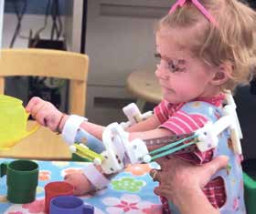 Die mitwachsende Handprothese (Abb. 13) „AMaProsthesis (AMaPro)“ ist speziell für Kinder entwickelt worden und kann dezentral auf „Fabbern“ oder 3‑D-Druckern sehr preiswert hergestellt, dem Wachstum angepasst (Abb. 14) oder repariert werden. Werkstoffe sind vor allem PLA-Filamente, die in allen Farben verfügbar und zudem umweltfreundlich sind. Auch die Prothese (Ausschnitt in Abb. 13) besteht aus mehreren Elementen, die einzeln gedruckt und dann montiert wurden. Zum Einsatz kommen unterschiedliche FFF-Drucker und Materialien sowie Bauteile aus dem Polymer-Jetting-Verfahren. Auch die im weiteren Sinne als Verbrauchsgut anzusehende Aufbissschiene (siehe Abb. 7) kann mit ausreichender Genauigkeit schnell und sehr preiswert mit Fabbern aus PLA hergestellt werden.