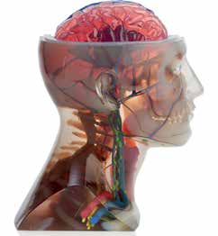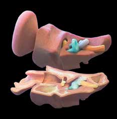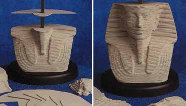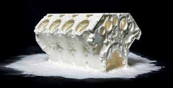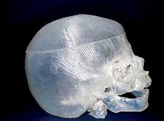 Durch den Einsatz gefärbter Binder kann das Verfahren auch kontinuierlich gefärbte Bauteile herstellen. Es existiert zudem ein gipsähnlicher Werkstoff, mit dem Orthopädie-Techniker vertraut sind. Er ist aber zur Substitution verstärkter Gipsformen weder technisch noch wirtschaftlich geeignet. Am Beispiel des geschnittenen Ohrmodells (Abb. 8) wird deutlich, dass das Verfahren sehr gut für Demonstrationsbauteile geeignet ist.