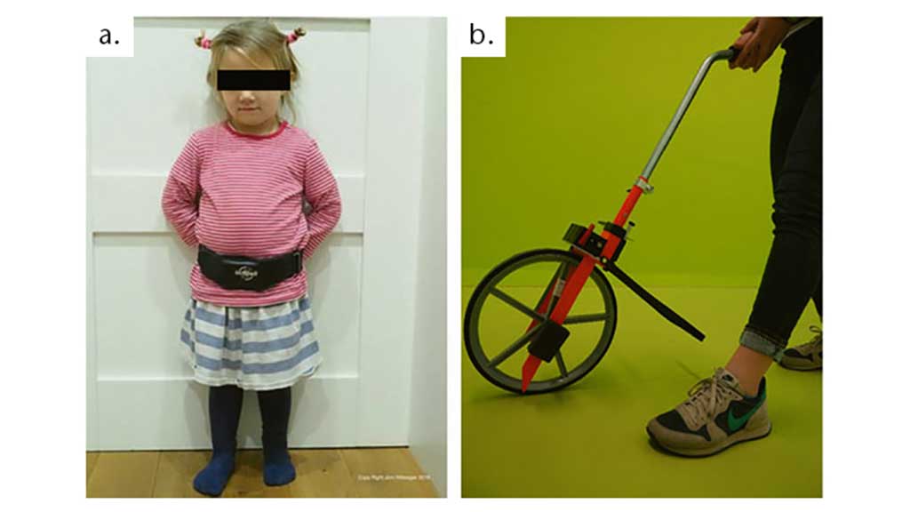 Die Datenerhebung begann frühestens einen Tag nach der Einwilligung der Teilnehmer (siehe Abb. 1). Zunächst wurde der 1‑Minuten-Gehtest (1mwt) auf einem standardisierten Parcours durchgeführt, der „Laborbedingungen“ entspricht. Eine 3D-Beschleunigungsmessbox (Actibelt©, München), die mittels eines elastischen Gürtels auf dem Körperschwerpunkt des Kindes angebracht war, wurde in der Nähe der vorderen Symmetrieachse getragen (Abb. 2a). Während des 1mwt verfolgte einer der Tester mit einem mobilen Laufrad (Abb. 2b) den Weg der Kinder so genau wie möglich, und die dabei gemessene Strecke diente zur Berechnung der Goldstandard-Laufgeschwindigkeit. Die Kinder wurden angewiesen, nach dem Ertönen eines akustischen Startsignals die markierte Strecke so schnell wie möglich zu gehen, ohne dabei zu rennen. Nach dem 1mwt wurde die Aufzeichnungsbox für die einwöchige Tragezeit zu Hause (1WHM) zur Messung unter „Real-World-Bedingungen“ übergeben. Neben der Aufzeichnungsbox wurde auch ein Fragebogen zur Beurteilung des Tragekomforts ausgehändigt (Tab. 2). Die Akzeptanz des Tragens wurde quantifiziert als a) Tragestunden pro Tag, b) Tragekomfort laut Fragebogen und c) Einschränkung bei ADL (ebenfalls per Fragebogen).