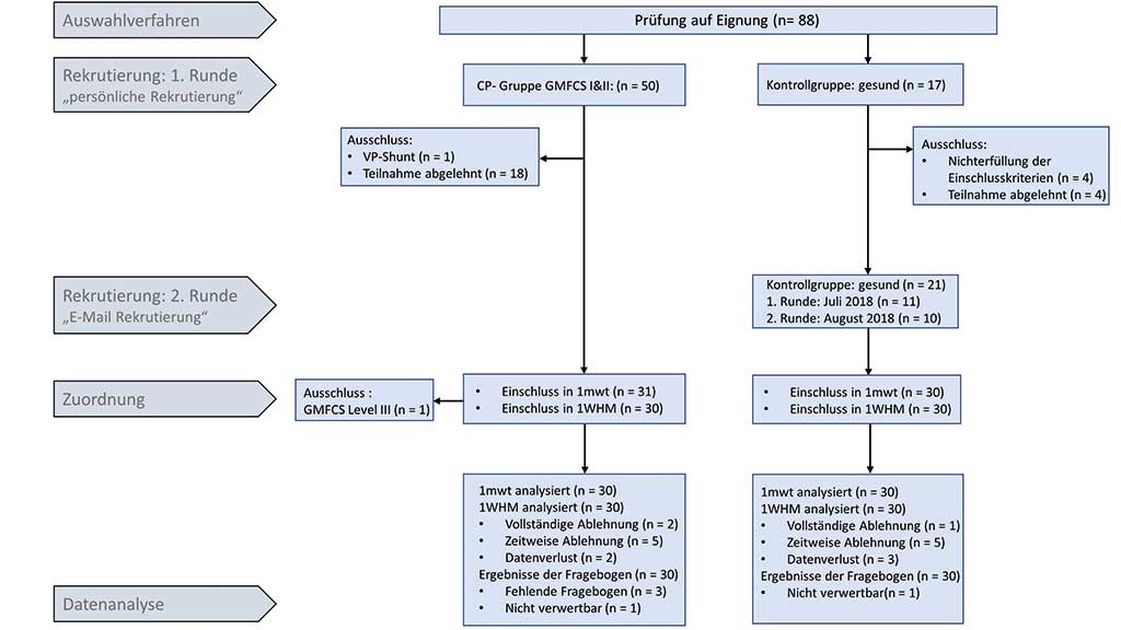 Sechzig Teilnehmer im Alter von 3 bis 12 Jahren wurden zwischen Mai und Oktober 2018 für diese kontrollierte, monozentrische, nicht randomisierte, beobachtende Querschnittstudie rekrutiert. Dreißig Kinder mit CP wurden unter den Patienten unserer Rehabilitationsklinik rekrutiert, und 30 gesunde Kontrollkinder (Ctrl) wurden aus den Familien der CP-Teilnehmer und des Klinikpersonals rekrutiert. Die Gruppen wurden durch Überprüfung der anthropometrischen Daten während des Rekrutierungsprozesses altersmäßig aufeinander abgestimmt. Ein Einschlusskriterium der CP-Kinder war die Einstufung in Stufe I und II der Gross Motor Function Classification Scale (GMFCS) (eine vollständige Liste ist in Tab. 1 enthalten). CP-Kinder wurden von der Studienteilnahme ausgeschlossen, wenn sie einen Vagus-Stimulator oder einen ventro-peritonealen Shunt hatten. Da keine Erfahrungen aus vorherigen Forschungsprojekten zu diesem Thema vorlagen, wurde keine formale Schätzung des Stichprobenumfangs vorgenommen. Eine Anzahl von 30 Kindern pro Gruppe wurde als a) klein genug angesehen, um mit den vorhandenen Ressourcen durchführbar zu sein, und b) als groß genug, um die Effektgrößen für die geplanten Endpunkte zu bewerten. Der Ablauf der Studie ist in Abbildung 1 dargestellt. Alle Teilnehmer gaben vor Studieneinschluss nach einem Aufklärungsgespräch ihre schriftliche Zustimmung, gegebenenfalls mit Unterstützung ihrer Eltern oder durch ihre Eltern. Die Studie wurde von der zuständigen lokalen Ethikkommission genehmigt und entsprach den Kriterien der Deklaration von Helsinki. Vor Beginn der Studie wurde sie beim deutschen Register für klinische Studien registriert (Registrierungsnummer DRKS00011919).