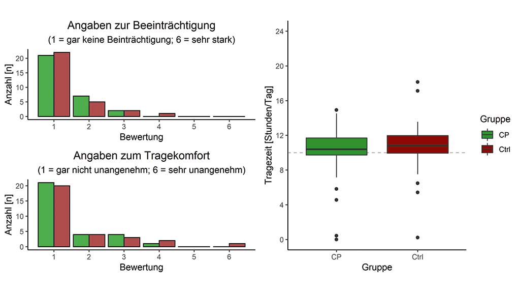 Die Mehrheit der Teilnehmer gab keine oder nur geringe Einschränkungen bei den Aktivitäten des täglichen Lebens bei 93,3 % der CP- und 90,0 % der Ctrl-Gruppe an (Abb. 4; kein Gruppenunterschied; U = 428; P = 0,9). Der Tragekomfort wurde in 66,6 % (n = 20) der Fälle in der Ctrl-Gruppe und in 70 % (n = 21) der Fälle in der CP-Gruppe als „sehr bequem“ eingestuft. Nur 3,3 % (n = 1) der Teilnehmer in Ctrl bewerteten den Tragekomfort als „sehr unangenehm“, während keiner der Teilnehmer in CP ihn als „sehr unangenehm“ bewertete (kein Gruppenunterschied; U = 441; P = 0,7). Die Tragedauer betrug 10,3 (SD 3,4) Stunden pro Tag, was zwischen den Gruppen vergleichbar war (T = 1,10; P = 0,3).