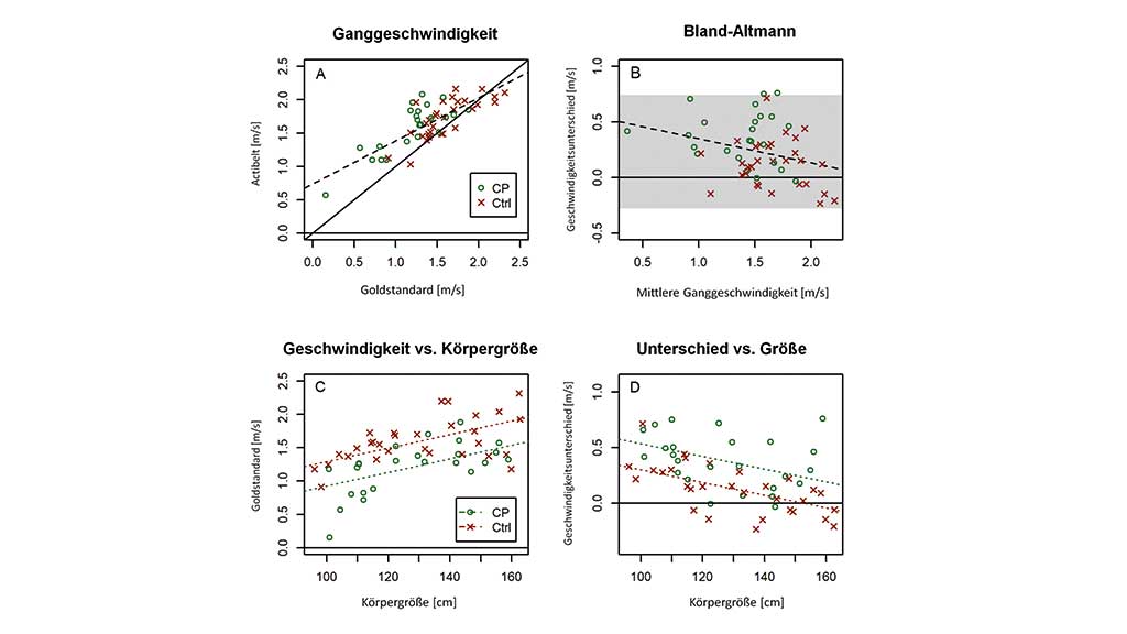 Für die statistische Analyse wurde SPSS Statistics 24 19 und die R‑Umgebung in ihrer Version 3.5.1 20 genutzt. Alle Datenanalysen folgten dem Intention-to-treat-Prinzip, da teilweise fehlende Daten (z. B. aufgrund von Datenverlust oder technischen Problemen) in den endgültigen Analysen berücksichtigt werden sollten. Für fehlende Daten wurde eine singuläre Imputation durchgeführt, wobei der Mittelwert für kontinuierliche Variablen (Tragezeit) und der Modus für ordinale Variablen (Komfort und Einschränkung) verwendet wurde. Die Normalverteilung wurde mit dem Shapiro-Wilk-Test und die Homogenität der Varianzen mit dem Levene-Test getestet. Die Daten zu Tragekomfort und Einschränkung bei ADL wurden mit dem Mann-Whitney-Test statistisch ausgewertet. Die Tragedauer wurde mit einem ungepaarten t‑Test untersucht. Pearson-Korrelationsanalysen wurden durchgeführt, um die Gemeinsamkeiten zwischen der Ganggeschwindigkeit mit Actibelt© und dem Goldstandard bei 1mwt zu bewerten. Bland-Altman-Diagramme wurden verwendet, um die Ganggeschwindigkeitsmessung mit 3D-Beschleunigungsmessung mit dem Goldstandard zu vergleichen. Statistisch wurden die Daten der Bland-Altman-Diagramme dann mit dem linearen gemischten Effekt (LME) unter Verwendung des R‑Befehls „lme“ aus dem Paket „nlme“ ausgewertet. LME-Modelle unterscheiden sich von der traditionellen Varianzanalyse dadurch, dass eine Normalverteilung nur für die Residuen, aber nicht unbedingt für die Daten selbst angenommen wird. Dies hat z. B. den Vorteil, dass LME-Modelle die Nichtnormalität der Körpermaße durch individuelle Anpassungen berücksichtigen können. LME-Modelle wurden mit y‑Daten (d. h. Differenzen in Bland-Altman-Plots) als abhängige Variable, Probanden als Zufallseffekt und x‑Daten (d. h. Mittelwerte in Bland-Altman-Plots) und Gruppe (CP oder Ctrl) als feste Effekte konstruiert. Auch die Einflussnahme der Körpergröße auf die Ganggeschwindigkeit innerhalb des Bland-Altman-Tests wurde mit solchen LME-Modellen untersucht. Zur Überprüfung der Gültigkeit der LME-Modelle wurden Residuen- und Q‑Q-Diagramme erstellt, und die Annahmen erwiesen sich als gültig. Darüber hinaus wurde eine partielle Regressionsanalyse mit dem R‑Paket „r2glmm“ durchgeführt, um den relativen Beitrag der Gruppe, der Körpergröße und der Ganggeschwindigkeit zu den Diskrepanzen zwischen dem Goldstandard und der mit dem Actibelt© gemessenen 1mwt-Geschwindigkeit zu berücksichtigen.