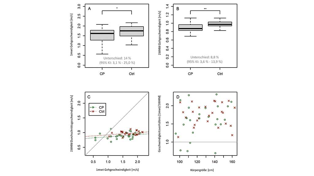 Beim Vergleich der Ganggeschwindigkeit (1mwt) beider Gruppen fand sich unter Laborbedingungen ein Unterschied zwischen CP und Ctrl (P = 0,018), der auf eine um 14,0 % (95 % CI: 3,1 % bis 25,0 %) höhere Ganggeschwindigkeit in Ctrl als in CP hinwies (P < 0,05; Abb. 6a). Beim Vergleich der realen Ganggeschwindigkeit (gemessen mit Actibelt©) zwischen den beiden Gruppen zeigte sich ebenfalls eine höhere Geschwindigkeit in der Gruppe Ctrl als in der Gruppe CP (P < 0,01, Abb. 6b).