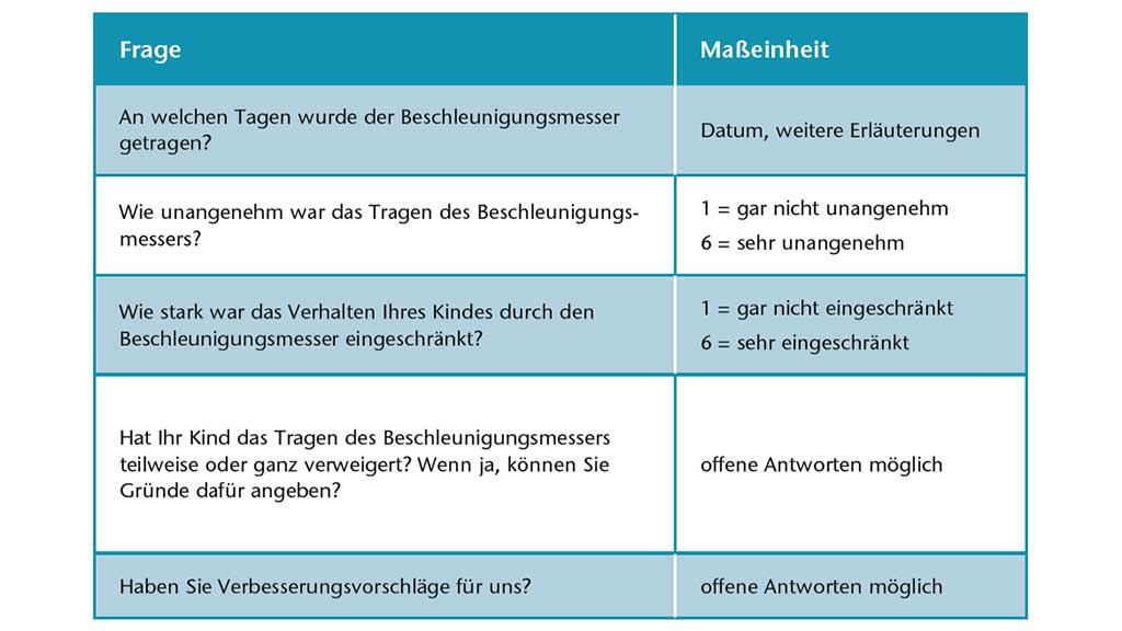 Die in diesem ersten Versuch gesammelten Daten zur Bewertung der Akzeptanz von 3D-Beschleunigungsmessgeräten bei Kindern im Alter von 3 bis 12 Jahren ergaben sehr gute Bewertungen des Tragekomforts und auch wenig Anzeichen für Einschränkungen bei ADL. In der Vergangenheit wurde eine Tragezeit von 10 Stunden pro Tag als Minimum angesehen. Allerdings muss dieser Wert überdacht werden, denn derzeit ist keine allgemein akzeptierte minimale Tragezeit für mobile Sensortechnologie für den pädiatrischen Bereich bekannt 21. Da der Zeitraum, den Kinder schlafend verbringen, wesentlich länger ist als bei Erwachsenen, wird die Tragedauer aufgrund der kürzeren täglichen Aktivität immer kürzer sein.