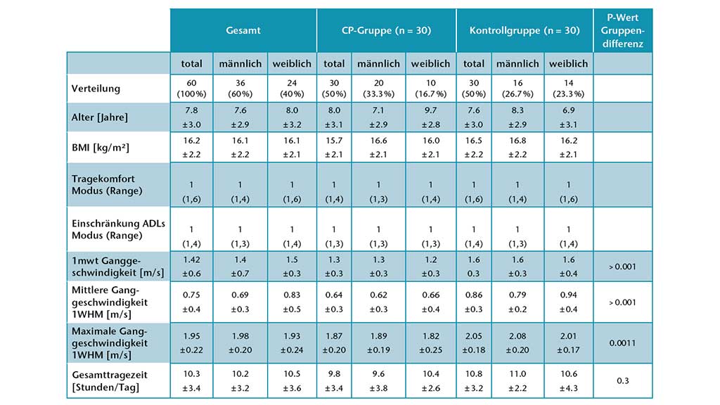Die Ergebnisse dieser Studie zeigen eine durchschnittliche Tragedauer von 9,9 bzw. 10,8 Stunden bei CP- bzw. Kontrollkindern, was als repräsentativ für die tägliche Aktivität von Erwachsenen angesehen werden kann 22. Dies alles deutet darauf hin, dass die Kinder in dieser Studie das um die Körpermitte zu tragende Gerät zur Messung der Ganggeschwindigkeit gut genug akzeptiert haben, um aussagekräftige Ergebnisse zu liefern. Man könnte argumentieren, dass CP-Kinder bereits vielen therapeutischen Interventionen und zusätzlichen Messungen ausgesetzt sind. Einerseits könnte dies das Zögern bei der Akzeptanz eines weiteren Geräts verringern, andererseits aber auch eine Abneigung gegen eine weitere Messung hervorrufen. Es wurde aber festgestellt, dass es keine Gruppenunterschiede beim Tragekomfort und bei den Einschränkungen bei den Aktivitäten des täglichen Lebens gab, was darauf hindeutet, dass Kinder mit und ohne Erkrankung eine ähnliche Akzeptanz zeigten. Dies lässt hoffen, dass diese Ergebnisse auf eine breitere pädiatrische Population übertragen werden können, obwohl dies natürlich in zukünftigen Studien nachgewiesen werden muss.