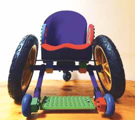 Eine Mobilitätshilfe zur Umsetzung einer leichten Fortbewegung für kleine Kinder, die diese im Laufe ihrer Entwicklung erhalten können, um selbstbestimmt ihre Umgebung wahrnehmen zu können, ist der „Duplikart“. Der Duplikart hat seinen Namen zu Recht, da er ein mitwachsender und überwiegend aus Lego- und Duplobauteilen bestehender Aktivsitz ist (Abb. 1a u. b). Der Rahmen besteht aus einer leichten Aluminiumkonstruktion. Die 12-Zoll-Räder dienen dem direkten Antrieb ohne Greifreifen; diese Radgröße ermöglicht dem Kind das bodennahe Sitzen, das Kinder im Alter von ca. einem Jahr bei normaler Entwicklung in der Regel beherrschen und umsetzen. Kinder mit instabiler Rumpfaktivität ab dem unteren Thorakalbereich können somit in den fast freien Sitz gelangen und sich statt krabbelnd oder robbend einfach rollend fortbewegen. Der Duplikart ist für den Innenbereich konzipiert; einige Familien setzen ihn jedoch auch erfolgreich draußen ein. Der Rollstuhl ist bewusst so designt worden, dass er aussieht wie ein Kinderspielzeug, um ihn in der frühkindlichen Welt als etwas ganz Normales erscheinen zu lassen, wie zum Beispiel ein Bobby-Car.