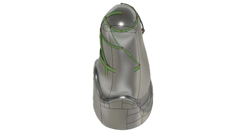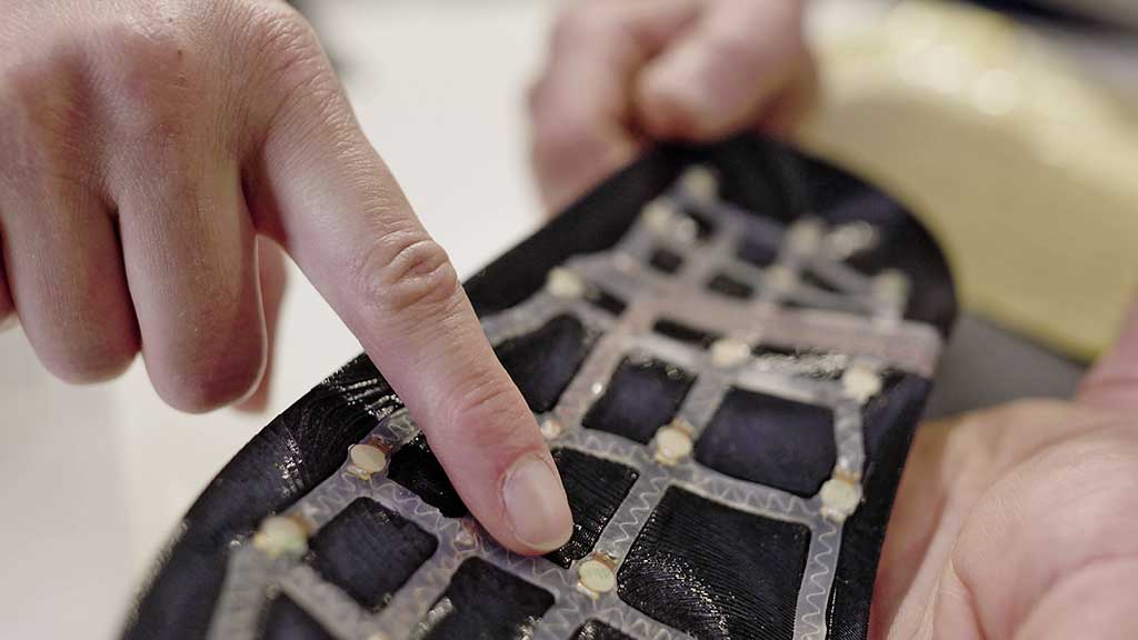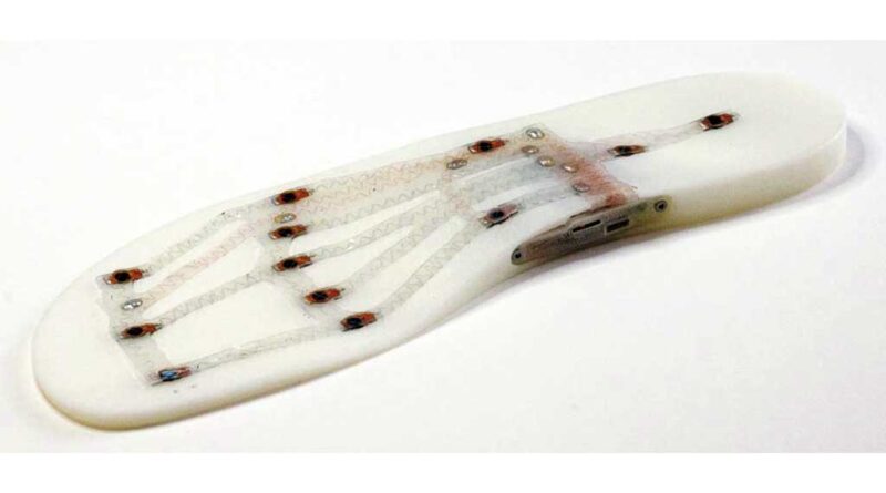 Abbildung 6 zeigt die Integration von Sensorik im CAD-Modell einer additiv fertigbaren Einlegesohle. Das 3D-Modell der Einlage wurde direkt mit dem Modell der Sensorik verknüpft und die notwendige Aussparung beim Druck der Sohle freigelassen. Natürlich können diese Aussparungen auch bei nicht additiv gefertigten Produkten erzielt werden – aber so spart man sich elegant einen Fertigungsschritt in der Produktion. Nachdem die Sensorik als Komponente eingebracht wurde, wird die smarte Einlegesohle mit einer Brandsohle finalisiert: Die Sensorik verschwindet im Produkt und liefert wertvolle Daten (Abb. 7).