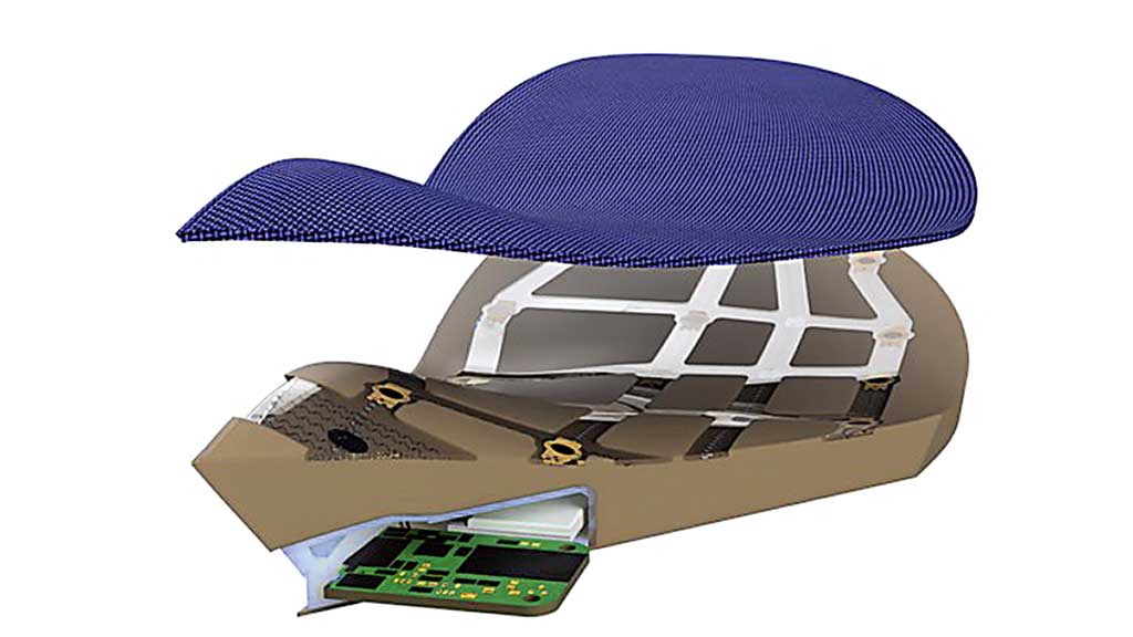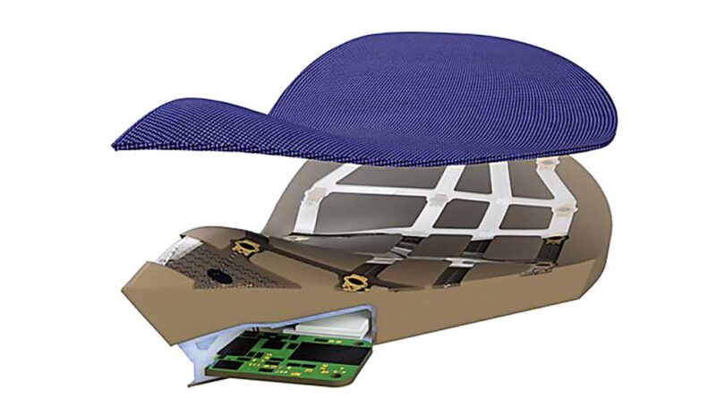 Meine Kindheit beiseite: Die Additive Fertigung ermöglicht, die Sensorikschicht als Upgrade direkt in einem digitalen Designschritt in das Hilfsmittel zu integrieren. Aussparungen (bzw. der Platz, den die Sensorik benötigt) werden im Produktdesign direkt berücksichtigt, sodass diese Schicht später nicht sperrig aufgebracht werden muss. Die Sensorik passt sich somit dem Produkt an und wird ein Teil davon. Eine Gitterstruktur der Sensorik, gepaart mit dem elastischen und flexiblen Trägermaterial (Abb. 5), ermöglicht die raumsparende Anpassung auch an komplexe Oberflächen.
