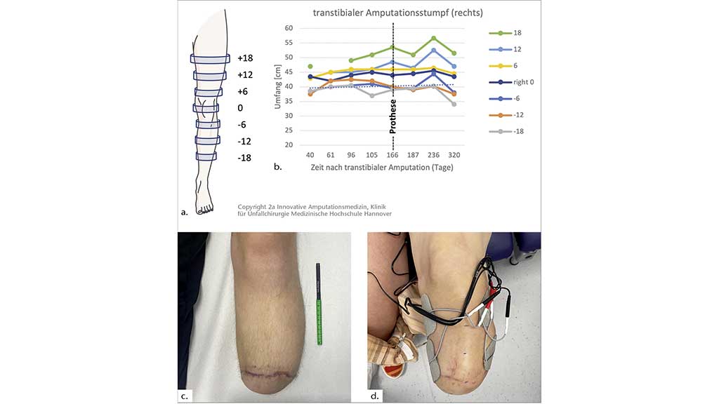 Dies wird in Abbildung 2 exemplarisch an einem rechten transtibialen Amputationsstumpf dargestellt. Trotz erwartet abnehmender postoperativer Schwellung bis zur Mobilisation in der Prothese wurde keine Umfangsreduktion, sondern eine Zunahme gemessen. Dies kann auf die im ausgehändigten Bewegungsprotokoll instruierte gezielte Anspannung der AMI-Muskeln ab der sechsten postoperativen Woche zurückgeführt werden. Nach regelmäßigem Gehen in der Prothese, hier gekennzeichnet als Ausgabe der Interimsprothese an Tag 166 nach Amputation (Anmerkung: Dies war eine sepsisassoziierte Amputation mit einer retrahierten Mobilisation aufgrund des initial sepsisreduzierten Allgemeinzustandes), verringert sich der Umfang in den überwiegenden Messpunkten. Dies kann auf die effektive Kompression des Schaftes unter täglicher Mobilisation in Zusammenhang mit einem residuellem Ödem zurückzuführen sein. Gefolgt wird dies von einem Umfangs-Peak an sechs von sieben Messpunkten. 100 Tage nach Mobilisation stabilisieren sich die Umfänge auf einem Wert direkt nach Amputation. Der Peak nach Mobilisation könnte eine reaktive Hypertrophie der Muskulatur als Antwort auf die Mehrbelastung in der Prothese sein.