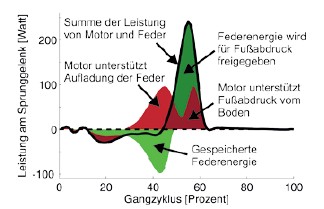 In Computersimulationen wurde berechnet, dass je nach Gangart (Gehen oder Rennen) und Fortbewegungsgeschwindigkeit unterschiedliche Steifigkeiten erforderlich wären, um größtmögliche Einsparungen für den Motor zu erhalten 8. Dies spricht für einen Mechanismus, der vergleichbar mit der Biologie seine Steifigkeit einstellen kann. Nachteilig wären hier wiederum der zusätzliche Bauraum und das Gewicht für solch einen Aufbau. Daher werden aktuell die aktiven Systeme für die häufigste Bewegungsform, das ebene Gehen mit mittlerer Geschwindigkeit, optimiert. Insbesondere nichtvariable Größen wie die Federsteifigkeit, die Dämpfung oder der Auslösewinkel der unidirektionalen Federn bringen dadurch oft energetische Nachteile für andere Bewegungsformen oder Geschwindigkeiten mit sich. Funktional kann aber durch die geschickte Anordnung von Feder und Elektromotor sowohl die Kraft als auch die damit verbundene Verkürzungsgeschwindigkeit der Wadenmuskulatur mit aktuell erhältlicher Technologie nachempfunden werden.