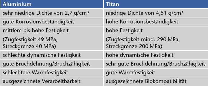 Die Metalle Aluminium und Titan sind in vielen Bereichen des täglichen Lebens anzutreffen. Auch in der Orthopädie-Technik sind sie angesichts ihrer individuellen Eigenschaften weit verbreitet. Während sich Aluminium besonders für eine handwerkliche Ver- und Bearbeitung eignet, ist Titan als hochfestes Metall eher bei vorgefertigten Bauteilen anzutreffen. Grundsätzlich kann ein Vergleich der Eigenschaften beider Metalle nur in Bezug auf die jeweilige Reinform erfolgen. Liegt, wie in den meisten Fällen, eine Legierung vor, so weichen die Eigenschaften oftmals deutlich vom Reinmetall ab. Im Folgenden werden Aluminium und Titan als Werkstoffe vorgestellt und miteinander verglichen, zunächst jeweils allgemein, sodann bezüglich ihrer Verwendung in Orthopädie- und Reha-Technik. Abschließend wird auf Titan-Aluminium-Legierungen und ihre Vorzüge eingegangen.