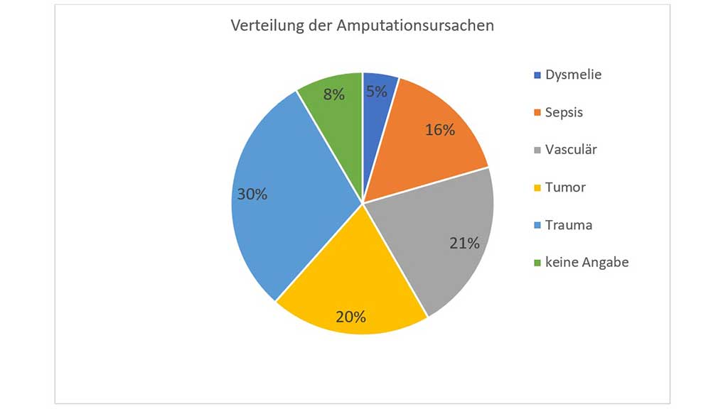 Einen Überblick über die Häufigkeit der jeweiligen Amputationsursache zeigt Abb. 2. Er spiegelt die lokalen Gegebenheiten wider, dass an unserem Zentrum traumatische und tumorbedingte Amputationen vermehrt durchgeführt werden und sich diese Patienten in einer fächerübergreifenden Sprechstunde vorstellen.
