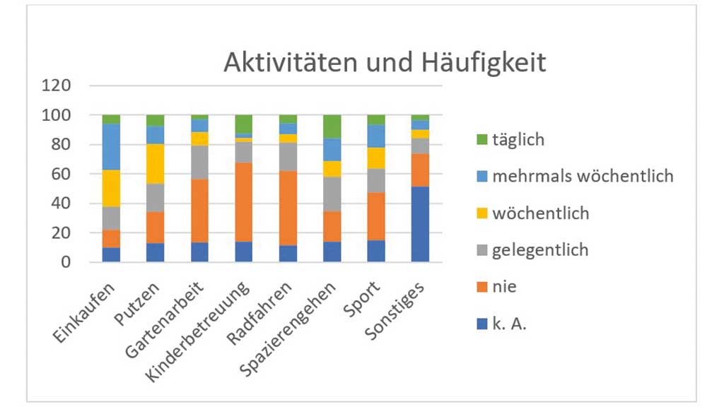 Die Auswertung kann natürlich auch für Subgruppen innerhalb der Kohorte erfolgen. So zeigt die Auswertung von Patienten nach Fußamputation, dass diese teilweise auch noch lange Zeit nach der Amputation keine adäquate prothetische Versorgung besitzen und lediglich mit provisorischen Hilfsmitteln wie Casts und Entlastungsschuhen versorgt sind 4. Aufgrund der Zentrums-bezogenen vergleichsweise häufigen Amputationen nach Trauma und Tumor kann diese Gruppe auch für sich näher betrachtet werden. Insgesamt sind diese Patienten fünf Jahre jünger als die gesamte Gruppe (im Mittel 52; Spanne 7–93 Jahre). Die Auswertung zur Mobilität zeigt, dass es sich um sehr aktive Patienten handelt, was die Abfrage nach Alltagsaktivitäten und deren Häufigkeit (Abb. 3) widerspiegelt.