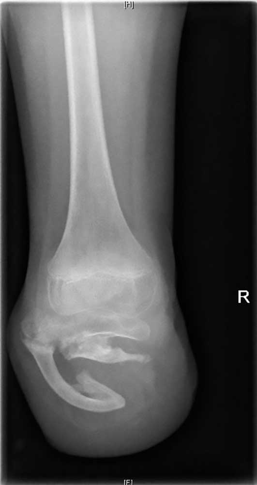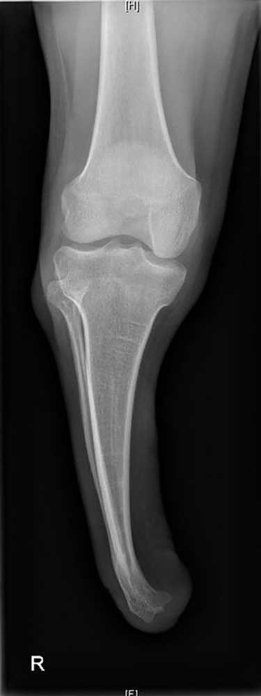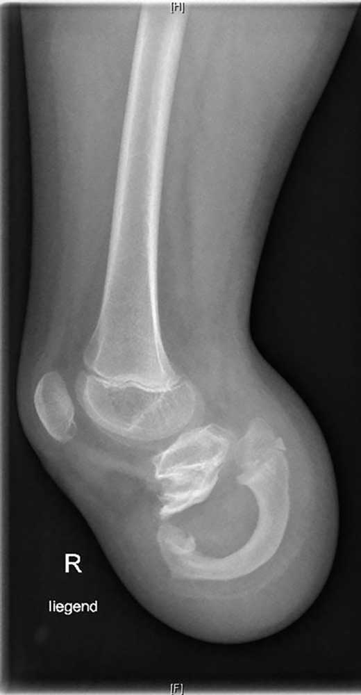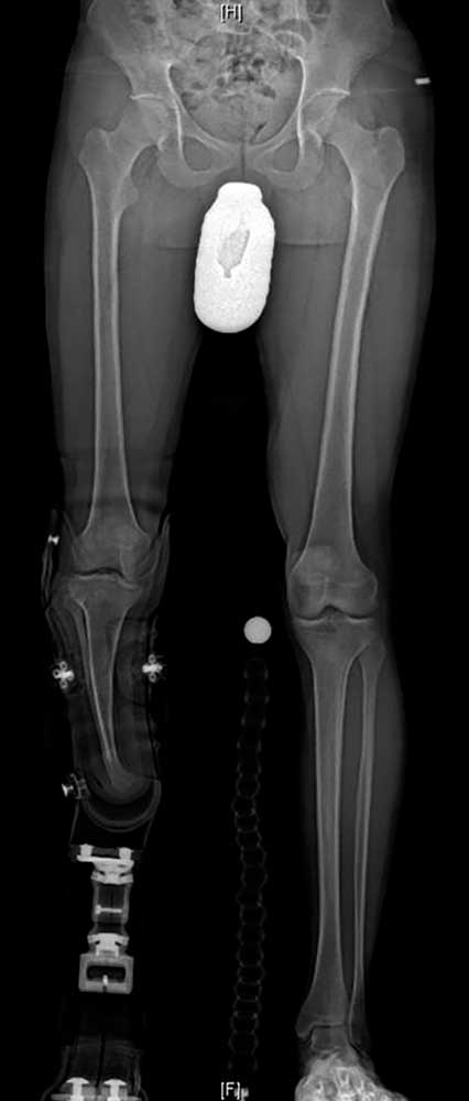 Es handelt sich um ein 9‑jähriges Mädchen, dem im Rahmen einer Streptokokkensepsis im Alter von 4 Jahren beidseitig die Unterschenkel amputiert wurden. Durch die frühe Amputation entstand eine sehr kurze Tibia, die sich im weiteren Verlauf jedoch nicht weiterentwickelte. Erfreulicherweise hat sich aber die Fibula durch die besondere Belastung und den „Prothesendruck“ der Tibia quasi unterstellt (Abb. 2). Somit ist nicht nur eine ausreichende Stumpflänge zur Prothesenversorgung, sondern auch eine ausreichende Stabilität gegeben, wodurch das Kniegelenk funktionell erhalten bleibt. Zwar müssen dabei aufgrund der sehr kurzen und eigentümlichen Hebelverhältnisse bestimmte Einschränkungen hinsichtlich der Kraftübertragung zwischen Stumpf und Schaft in Kauf genommen werden, und die Bettung des Stumpfes erfordert besondere Modelltechniken, die nicht analog zu einem klassischen Stumpf sind, aber es ergeben sich doch gute funktionelle Ergebnisse. Dennoch bedarf es einer engen Anbindung an das Versorgungsteam und einer engmaschigen Kontrolle der Patientin im weiteren Verlauf, um potenziell negativen Entwicklungen rechtzeitig begegnen zu können.