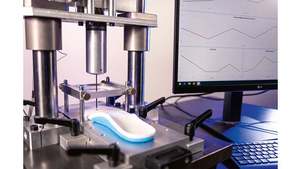 Interessant sind in diesem Zusammenhang die unterschiedlichen Aussagen zu den Materialvorgaben. Während die PG 31 relativ viel Freiheit zulässt und eine indikations- und gewichtsbezogene Materialauswahl vorschlägt, geben Bus et al. präzisere Angaben über die verschiedenen zu verwendenden Materialtypen an. Das Grundprinzip eines vertikalen Sandwich-Aufbaus (Abb. 4) mit weicheren Materialien zum Fuß hin und fester werdenden Materialien zur Brandsohle des Schuhs zur Stabilisierung ist das Gleiche. Allerdings geben die Studienautoren genauere Hinweise zur Stärke und zu den dynamischen Eigenschaften der einzelnen Materialschichten. Das von den Autoren empfohlene geschlossenzellige Schaummaterial (z. B. Plastazote oder EVA) verhält sich unter längerer Belastung plastisch, d. h., es formt sich in den stärker belasteten Fußregionen dem Fuß etwas an. Anders sieht es mit dem darunter liegenden offenporigen Polsterschaum (in der Regel auf PU-Basis) aus, der auch bei längerer Belastung durch den Patienten fast keine Verformung aufweist. Grundsätzlich eignet sich die sowohl in der PG 31 als auch die von Bus et al. beschriebene Messmethode zur Shore-Härte-Bestimmung aber nicht für die Beschreibung der dynamischen Materialeigenschaft, also des Verhaltens des Materials unter Belastung und Entlastung unter zeitlich und belastungsmäßig definierten Simulationen der realen Belastungssituation beim Gehen von Diabetespatienten. Diese Eigenschaften können nur mit biomechanisch orientierten Prüfverfahren z. B. nach DIN 51220 (Abb. 5), beschrieben werden. Mit dieser Messmethode lassen sich auch Langzeitbelastungen simulieren15.