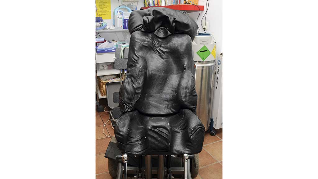 Für eine erste Formsimulation der späteren Sitzschalenversorgung benötigt der Techniker eine möglichst exakte Abformung des Körpers mithilfe eines Vakuumabdruckes. Der Patient wird hierfür vollständig bekleidet in einem Rollstuhl auf drei mit Styroporkügelchen gefüllte und mit Luft aufgepumpte Latexkissen positioniert (Abb. 2). Das Material erlaubt dem Techniker, die Ausrichtung des Patienten kontinuierlich anzupassen und unterschiedliche Positionierungen zu testen. Die Positionierung erfolgt mithilfe zweier Mitarbeiter und grundsätzlich von unten nach oben.