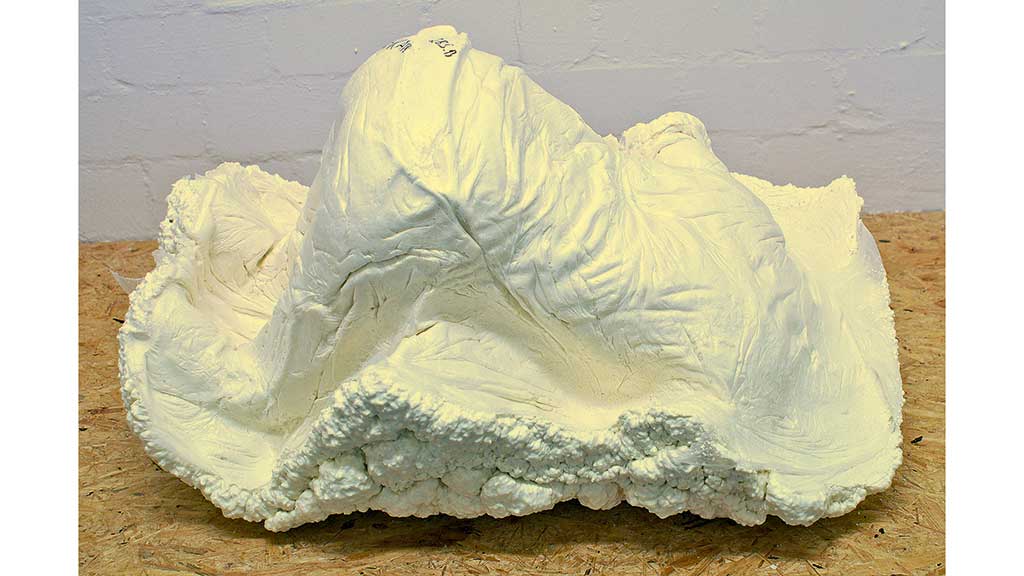 Ist das Positivmodell ausgehärtet, werden Falten, Asymmetrien und überflüssige Übergänge per Hand entfernt und das Modell geglättet, bis es exakt dem Körperabdruck des Patienten und den Erkenntnissen aus der vorangegangenen Palpation entspricht (Abb. 6). Diese Methode ermöglicht dem Techniker, das Modell fein herauszuarbeiten.