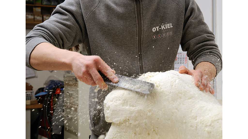 Nach einer halben Stunde ist der Schaum ausgehärtet und wird entformt. Die zuvor auf das Positivmodell aufgebrachte Teflonschicht erleichtert die Ablösung der Innenschale vom Positivmodell. Per Laserlot legt der Techniker dann die Zuschnitte fest und schneidet das Modell mit der Bandsäge auf Form.