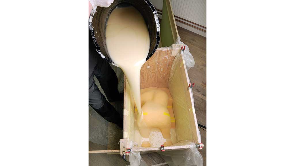 Um den Guss der Innenschalenform anzufertigen, befestigt der Techniker das Positivmodell in einer verstellbaren Schäumkiste aus Holz und schäumt die Kiste anschließend mit einem speziell für die Firma OT-Kiel entwickelten Vierkomponentenschaum aus (Abb. 7).