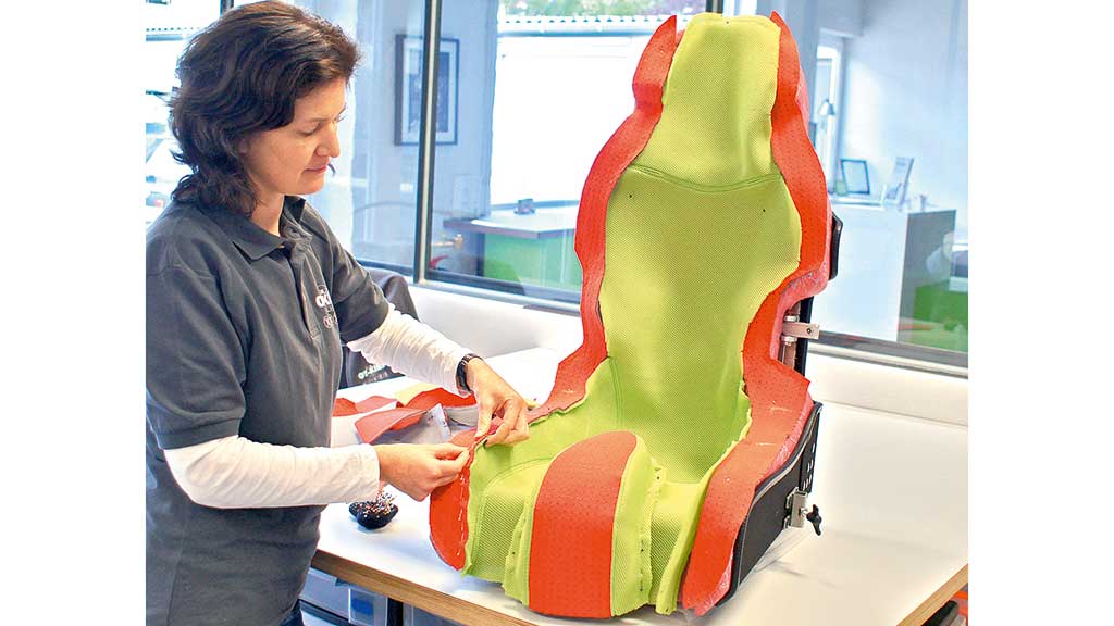Wenn der Außenkorpus fertig gebaut ist, werden alle Einzelkomponenten mit einem hochreißfesten, schmutz- und wasserabweisenden und abriebfesten Gewebe bezogen und mit einem Kantenschutz aus Gummi versehen. Für das Untergestell installiert der Techniker eine Sitzaufnahme. Bei Bedarf bringt er zusätzlich Befestigungsmöglichkeiten für Armlehnen an.