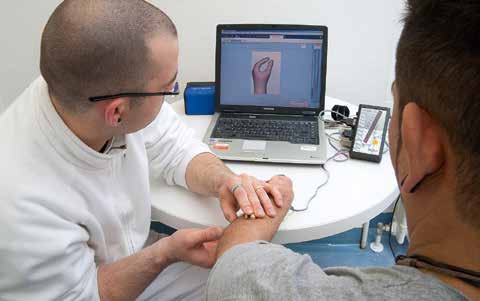 Bei der dynamischen Anprobe in der Werkstatt wurde der Randverlauf des Gießharzcontainers und möglicher Spangen auf ihre Nutzbarkeit und ihren Einfluss auf die Weichteilverhältnisse überprüft. Dabei sollte die Prothese einerseits beschwerdefrei an- und abgelegt werden können, andererseits sollten die Spangen genügend Stabilität der Prothese in der Dynamik gewährleisten. Die Passform des Schaftes wurde erneut unter Berücksichtigung der veränderten Belastungssituation durch das Gewicht der Strukturteile und der neu entstandenen Hebel geprüft. Auch die Bewegungsausmaße wurden mit den Werten ohne Hilfsmittel verglichen, um die Beeinträchtigung bewerten zu können. Es folgten erste einfache Funktionstests der elektronischen Komponenten, aus denen sich neben der Einstellung der Softwareparameter auch eine erneute Anpassung der Elektrodenposition, des Anpressdrucks oder ihrer Einstellung durch die geänderte Belastung ergab (Abb. 5). Etwaige Änderungen erfolgten erneut unter Zuhilfenahme computerunterstützter EMG-Signalkurven.