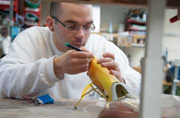 Anschließend wurde der Aufbau der Greifkomponente aus dem Übertragungsgerät reproduziert und das Verbindungssegment zwischen Schaft und Handgelenksansatz gemäß dem Zuschnitt aus der Testprothese in Faserverbundtechnik hergestellt. Dabei wurden Randverlauf, Rahmengestaltung und gestaffelte Flexibilitäten beachtet. Das Verbindungssegment spiegelte dabei nicht die exakte anatomische Außenform wider, da gemäß Qualitätsstandard im späteren Verlauf ein anatomischer Formausgleich aus Schaumstoff geschaffen werden sollte. Vielmehr berücksichtigte es in besonderem Maße Be- und Entlastungszonen des Stumpfes sowie die Weichteilverschiebung in der Dynamik. Mit Hilfe von Platzhaltern (Dummys) fanden die funktionellen Bauteile Berücksichtigung, damit sie später erschütterungsfrei und geschützt verbaut werden konnten.