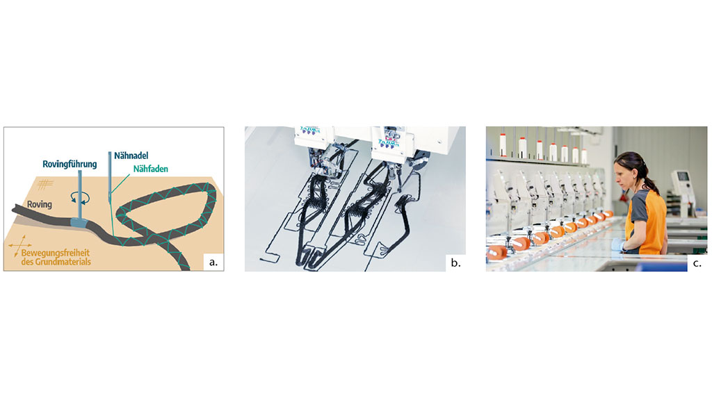 Das TFP-Verfahren selbst basiert auf dem Einsatz modifizierter industrieller Stickautomaten. Durch eine CNC-Steuerung (CNC = Computerized Numerical Control) können komplexe Faserverläufe entlang eines zuvor mittels Computer Aided Design (CAD) definierten Legemusters automatisiert hergestellt werden. Im Gegensatz zu anderen additiven Fertigungsverfahren, etwa dem 3D-Druck mit Endlosfaserverstärkung, können dabei jedoch nahezu beliebige Verstärkungsfaserarten – bspw. aus Glas, Basalt, Kohlenstoff oder Polymeren, trocken oder als thermoplastisches Hybridgarn bzw. duroplastisches Towpreg (vorimprägnierter Roving) – in unterschiedlichen Faserbündelstärken verwendet werden. Die Verstärkungsfasern werden dabei mittels eines dünnen Ober- bzw. Unterfadens im Zickzack-Stich auf einem frei wählbaren Trägermaterial aufgenäht (Abb. 2a u. b). Durch den Einsatz von Nähfäden geringer Stärke wird sichergestellt, dass das abgelegte Fasermaterial nur wenig onduliert und somit eine Reduktion der effektiven mechanischen Kennwerte so niedrig wie möglich gehalten wird. Die textile Bindungsart ermöglicht – ebenfalls im Unterschied zum 3D-Druck mit Endlosfaserverstärkung – ein problemloses Umformen der TFP-Preformen und dadurch die Herstellung anspruchsvoller, räumlich gekrümmter FKV-Bauteile. Diese Eigenschaft in Verbindung mit einer für generative Fertigungsverfahren sehr hohen Produktivität durch den Einsatz von TFP-Legeautomaten mit mehreren Legeköpfen (Abb. 2c) macht es für eine Vielzahl von Leichtbauanwendungen sehr interessant.