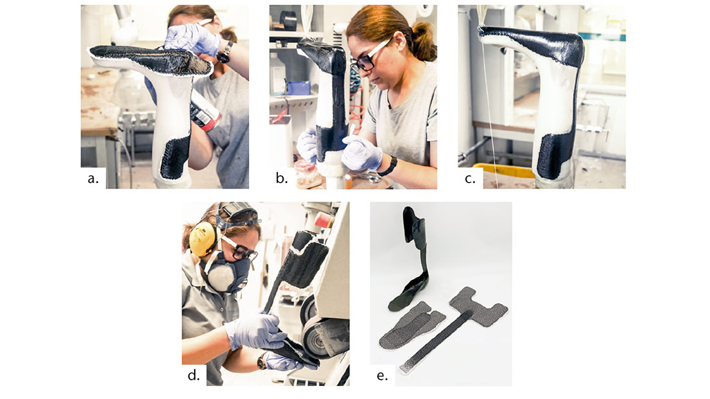 Noch relativ unbekannt sind dagegen die Einsatzmöglichkeiten des Tailored-Fiber-Placement-Verfahrens, das viele Vorteile für die handwerkliche Herstellung orthopädischer Bauteile bietet: Die ideale Faserausrichtung im Bauteil wird bereits bei der TFP-Preformherstellung so voreingestellt, dass bei der Applikation auf dem Infiltrationsmodell nicht mehr darauf geachtet werden muss. Zudem kann der Verschnitt des Verstärkungsfasermaterials durch endkonturnahe Fertigungsmöglichkeiten auf ein Minimum reduziert werden. Auch die nahezu unbegrenzte Lagerfähigkeit einmal hergestellter TFP-Preformen befähigt handwerkliche Unternehmen, den Fertigungsprozess schnell und mit gleichbleibender Qualität durchzuführen. In Abbildung 3 sind die typischen Herstellungsschritte bei der Anwendung einer TFP-Preform für den Orthesenbau dargestellt.