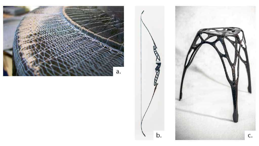 Das Tailored-Fiber-Placement-Verfahren (TFP-Verfahren) wurde Anfang der 1990er Jahre am Leibniz-Institut für Polymerforschung Dresden e. V. als Verfahren zur endkonturnahen und variabelaxialen Ablage von Verstärkungsfaserbündeln (sogenannten Rovings) entwickelt 2. Das Verfahren, das heute zu den generativen Fertigungsverfahren für textile sogenannte Preformen (Vorformlinge) gezählt werden kann, lässt sich nicht nur für Rapid-Prototyping-Anwendungen einsetzen. Für eine Vielzahl anspruchsvoller Leichtbauteile wird es bereits zur Serienproduktion genutzt: Mittels TFP hergestellte FKV-Bauteile finden sich heute bereits in der Luft- und Raumfahrt (bspw. am Fensterrahmen des Airbus A350; Abb. 1a), im Maschinenbau, in der Sport- und Freizeitgüterindustrie (Prototyp „Leichtbaubogen rec° 16“; Abb. 1b) sowie im Möbelbau (Prototyp „Leichtbauhocker L1“; Abb. 1c).