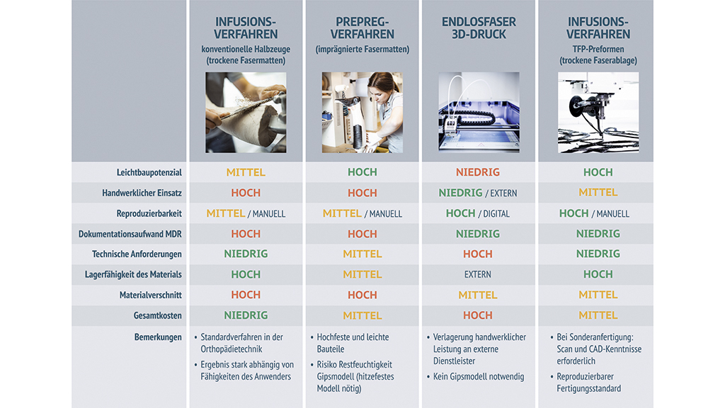 In der in Abbildung 4 gezeigten Gegenüberstellung der zuvor beschriebenen Technologien wird ersichtlich, dass das TFP-Verfahren im Bereich der Fertigung orthopädischer Hilfsmittel viele Vorteile bietet: