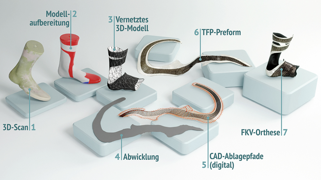 - Im Gegensatz zum 3D-Druck verbleibt die eigentliche Fertigung im orthopädischen Fachbetrieb und der gesamte Herstellungsprozess in den Händen des Anwenders. Dabei wird die TFP-Preform als Materialkomponente bestellt und entsprechend mit den etablierten Infiltrationsverfahren (Harzguß) weiterverarbeitet.