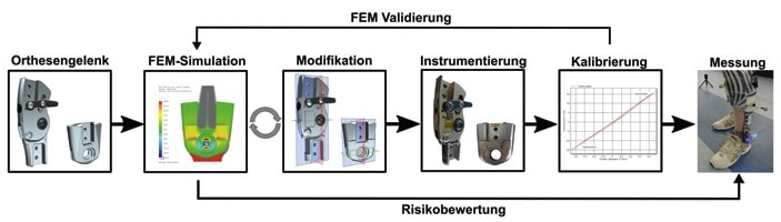 Die grundlegende methodische Vorgehensweise zur Überwindung dieser Herausforderungen ist in Abbildung 1 dargestellt. Ausgangspunkt der Sensorentwicklung ist ein marktübliches Orthesengelenk. Die Verfahrensweise für den methodischen Entwicklungsprozess erfordert den Aufbau eines abstrakten, aber der Realität entsprechenden Finite-Elemente-(FE-)Modells. Die Lagerungs- und Krafteinleitungsbedingungen sowie die Werkstoffdaten müssen dabei bekannt sein. Der Volumenkörper soll in geeigneten Bereichen idealisiert sein, über ein geeignetes FE-Netz mit entsprechender Netzsteuerung und Elementen mit erforderlichen Freiheitsgraden und Feinheit verfügen sowie die Lagerungs- und Krafteinleitungsbedingungen angemessen abbilden. Das Ziel lautet, den Sensor anforderungsgerecht hinsichtlich Mechanik und Sensorik (Bauraum, Festigkeit, Verformung, Linearität, Signalhub, Quersprechen, Signalrauschen) zu konzipieren.