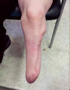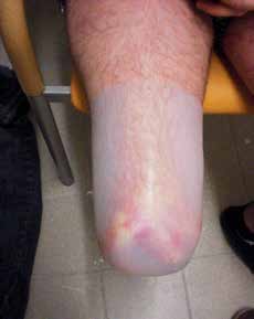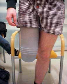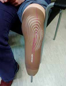 Weiterhin stellen auch prominente Knochenvorsprünge für jeden Techniker eine besondere Herausforderung dar, da der Liner sowohl während des Gipsabdruckes als auch beim Tragen der Prothese hier mit erhöhter Spannung anliegt. Selbst eine Mikroentlastung durch den Schaft beseitigt die permanente erhöhte Spannung durch den Liner nicht. Ein weiterer interessanter Punkt trat während der Testversorgungen in Erscheinung: Eine Anwenderin berichtete, dass ihr Unterschenkelstumpf seit der Anwendung des Maßliners weniger zur Ödembildung neige, was den Anziehvorgang der Prothese am Morgen erleichtere. Dieser Effekt dürfte auf die gleichmäßige Druckverteilung am Stumpf, auch in konkaven Bereichen und während der Schwungphase sowie beim Sitzen, zurückzuführen sein.