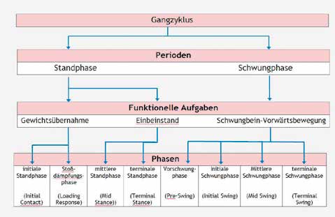 Abgeleitet von der Stand- und Schwungphase des Ganges ergeben sich drei Hauptaufgabenfelder: die Gewichtsübernahme, der Einbeinstand sowie die Schwungbein-Vorwärtsbewegung. Abbildung 1 zeigt, wie die einzelnen Gangphasen zuzuordnen