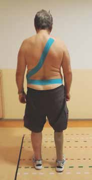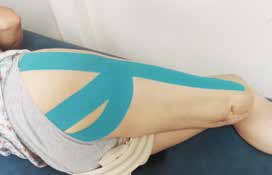 Aufgrund dieser Erkenntnisse wurde die Tapeanlage wie folgt angelegt: Zunächst wurden bei Gruppe I (10 Patienten) Gesäß- und Oberschenkelmuskulatur sowie Rückenmuskulatur getapt mit dem Ziel, die Muskulatur des betroffenen Beines zu unterstützen. Dabei wurden der M. tensor fasciae latae sowie der M. gluteus maximus und medius mittels Muskeltapeanlage im Sinne einer aktiveren Hüftextension und verbesserten Standbeinfunktion unterstützt (Abb. 2).