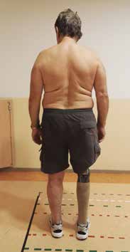 Der Stumpf ließ vor allem bei den oberschenkelamputierten Patienten einen erhöhten Tonus der Hüftflexoren aufgrund funktioneller Verkürzungen der Hüftflexoren sowie eine Abschwächung der Hüftextensoren und ‑abduktoren erkennen (Abb. 1 u. 2). Alle Patienten zeigten eine Lateralflexion zur amputierten Seite sowie eine Gegenrotation des Beckens (Abb. 3). Dieses typische Gangmuster ist biomechanisch begründbar, da ein verkürzter Hebel des Körpergewichtes letztlich einen verringerten Kraftaufwand für die pelvitrochantäre Muskulatur bedeutet, belegbar durch die Berechnung der Kraft des Muskels: Fm = Fg × (hg : hm).