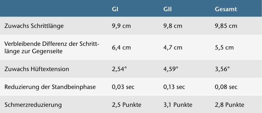 Der Zuwachs der Schrittlänge des „gesunden“ Beines während der Standbeinphase des prothetisch versorgten Beines betrug im Durchschnitt aller Patienten 9,85 cm: bei Gruppe I 9,9 cm, bei Gruppe II 9,8 cm (Abb. 5). Gegenüber der Schrittlänge der Gegenseite konnte die Differenz im Durchschnitt aller Patienten bis auf ‑5,5 cm (ohne Tape 15,35 cm) angenähert werden (Abb. 6). Bei Gruppe I betrug die Differenz ‑6,4 cm (ohne Tape 16,3 cm), bei Gruppe II ‑4,7 cm (ohne Tape 14,5 cm). Der Zuwachs der Hüftextension am Ende der Standbeinphase des prothetisch versorgten Beines betrug im Durchschnitt 3,56°: bei Gruppe I 2,54°, bei Gruppe II 4,59° (Abb. 7).