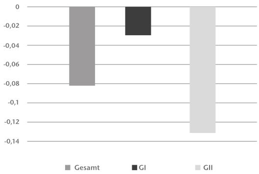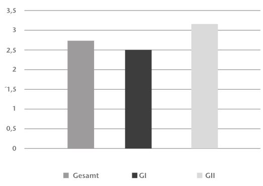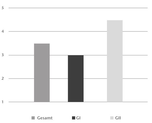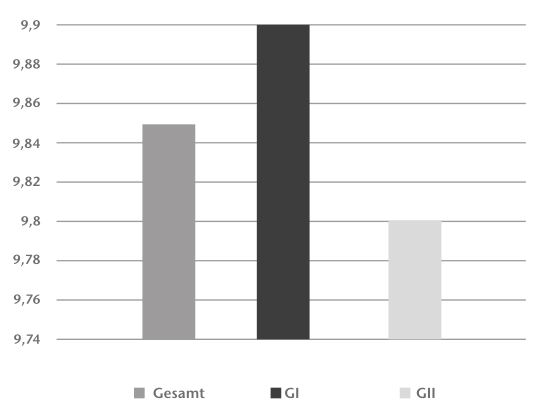 Die Verweildauer auf dem prothetisch versorgten Bein während der Standbeinphase verringerte sich im Durchschnitt um 0,08 sec: bei Gruppe I um 0,03 sec, bei Gruppe II um 0,13 sec (Abb. 8). Die Schmerzen im ISG-/LWS-Bereich verringerten sich im Durchschnitt um 2,8 Skalenwerte: bei Gruppe I um 2,5, bei Gruppe II um 3,1 auf der Visuellen Analogskala (Abb. 9).