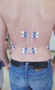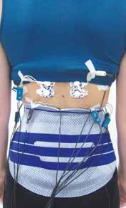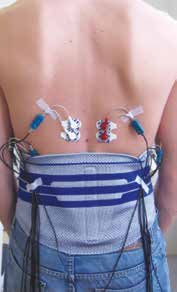 Die Lage der untersuchten Muskeln ist in Abbildung 2 schematisch dargestellt; Abbildung 3 zeigt die applizierten Elektroden anhand von Probandenbildern. Die Auswahl der untersuchten Muskeln richtete sich neben ihrer durch die paarige Anordnung entlang der Wirbelsäule anatomisch ableitbaren Extensionsund Rotationswirkung auf die Wirbelsäule 29 insbesondere auch nach ihrer unterschiedlich definierten Funktion hinsichtlich der Stabilisierung (M. multifidus) oder der Mobilisierung (M. longissimus und M. iliocostalis) des Rumpfes 30 31.