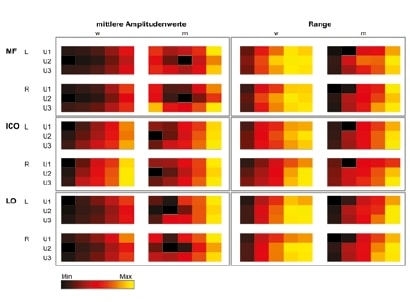 Zum Zeitpunkt U2 konnte für MF und LO bei beiden Geschlechtern eine tendenzielle Verminderung der mittleren Amplitudenwerte beobachtet werden, die für den LO im Ausmaß und in der Anzahl signifikanter Unterschiede für die untersuchten Frauen deutlich ausgeprägter war als für die Männer (Frauen MF und LO ‑11 % bis ‑5 %; Männer LO ‑9 % bis ‑6 %; Abb. 5). Dieser Trend zur Verringerung der mittleren Amplitudenwerte kehrte sich zum Zeitpunkt U3 jedoch mehrheitlich um. Lediglich die mittleren Amplituden für den LO der Frauen blieben weiterhin tendenziell vermindert, wiesen jedoch nur noch punktuell signifikante Unterschiede auf. Für den ICO ließen sich jedoch praktisch durchgehend tendenziell zu U2 und deutlich stärker, mit mehreren signifikanten Unterschieden zu U3, Anstiege der mittleren Amplituden nachweisen (s. Abb. 5). Die Range wies unabhängig vom Geschlecht deutliche, oftmals signifikant erhöhte Werte sowohl zu U2 als auch zu U3 auf, wobei sowohl die Ausprägung als auch die Anzahl nachweisbarer Signifikanzen für die Frauen erneut höher war als für die Männer (s. Abb. 5).
