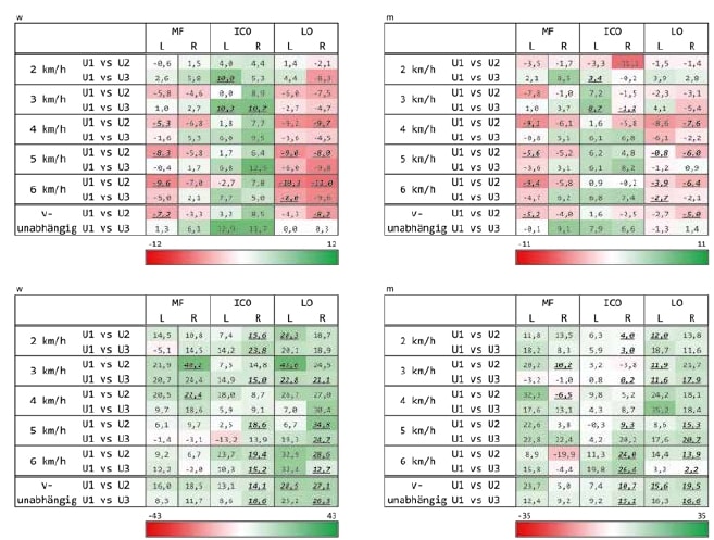 Für beide Parameter sind die beschriebenen Effekte ohne Berücksichtigung der unterschiedlichen Gehgeschwindigkeiten in der ebenfalls dargestellten geschwindigkeitsunabhängigen Betrachtung zusammengefasst (s. Abb. 5).