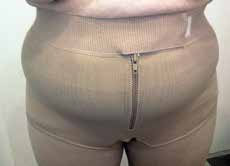 Ausführungen und Versorgungsformen werden unter Berücksichtigung von Handling, Kraft, Alter, Compliance und Begleiterkrankungen des Patienten, u. a. Adipositas, gewählt (Abb. 1 und Abb. 2). Variationsmöglichkeiten einer geteilten Versorgung sind hierbei oft unumgänglich (Abb. 3). Einer empfindlichen Haut kann durch form- und funktionsgerechte Stricktechnik (Abb. 4), partielles Einbringen von Futterstoff, Silikonauflagen, Silberfäden oder Reißverschlüssen zur besseren Platzierung von Wundauflagen begegnet werden. Bei der Vermessung des Patienten sollten nicht nur die Zugmaße, sondern auch die Hautmaße notiert werden. Nur so ist eine Vergleichbarkeit der Maße im weiteren Therapieverlauf möglich. Die Anpassung der Strümpfe sollte zeitnah erfolgen. Anziehen und Pflege der Bestrumpfung müssen erklärt werden. Die Vereinbarung eines Kontrolltermins sowie eine Wechselversorgung runden die Beratung ab.
