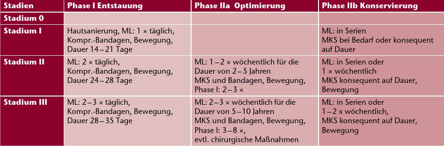 Die Komplexe Physikalische Entstauungstherapie (KPE) ist in zwei Phasen unterteilt, die sich in Zielsetzung und Ausführung unterscheiden: Während Phase 1 die optimale Entstauung, d. h. die Ödemreduktion, zum Ziel hat, dient Phase 2 der Optimierung bzw. Konservierung des erreichten Therapieerfolges 1. Földi beschreibt in den Leitlinien der Kompressionsverordnung 2 die stadiengerechte Anwendung der KPE bei Lymphödemen und definiert darin die Frequenz der manuellen Lymphdrainage (MLD), die Dauer der einzelnen Phasen und die Anwendung lymphologischer Kompressionsverbände oder medizinischer Kompressionsstrümpfe entsprechend dem Ödemstadium (Tab. 1).
