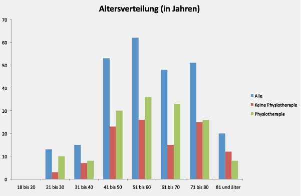 Von den eingeschlossenen Patienten waren sowohl in der Physiotherapiegruppe als auch in der Behandlungsgruppe ohne Physiotherapie die meisten Patienten zwischen 51 und 60 Jahre. Eine genaue Altersverteilung ist in Abbildung 1 dargestellt.