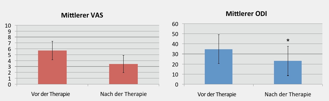 Insgesamt zeigte sich durch die Therapie eine signifikante Verbesserung des mittleren VAS von 5,7 ± 1,6 SD auf 3,4 ± 1,5 SD (p ≤ 0.001) (Abb. 2). Des Weiteren konnte auch eine Verbesserung der Lebensqualität erzielt werden: Der ODI verbesserte sich signifikant von 34,8 % ± 14,3 % SD auf 23,1 % ± 14,5 % SD (p ≤ 0.001) (siehe Abb. 2).