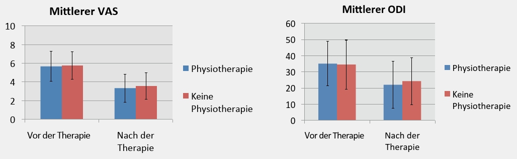 Die beiden Behandlungsgruppen zeigten keine signifikanten Unterschiede hinsichtlich der Schmerzreduktion und der Verbesserung der Lebensqualität. Eine separate vergleichende Betrachtung der beiden Behandlungsgruppen unterteilt nach Altersgruppen ergab in keiner der Altersgruppen auffällige Unterschiede der VAS-Änderung. Hinsichtlich der Änderung des ODI der einzelnen Altersgruppen zeigte die Physiotherapie-Gruppe bei Patienten zwischen 21 und 30 Jahren eine deutlichere ODI-Verbesserung im Vergleich zur gleichaltrigen Patientengruppe ohne Physiotherapie (Differenz der Änderung: 12.79). Gleiches ergab sich bei der Patientengruppe zwischen 41 und 50 Jahren (Differenz der Änderung: 14.62) und zwischen 61 und 70 Jahren (Differenz der Änderung: 9.43).