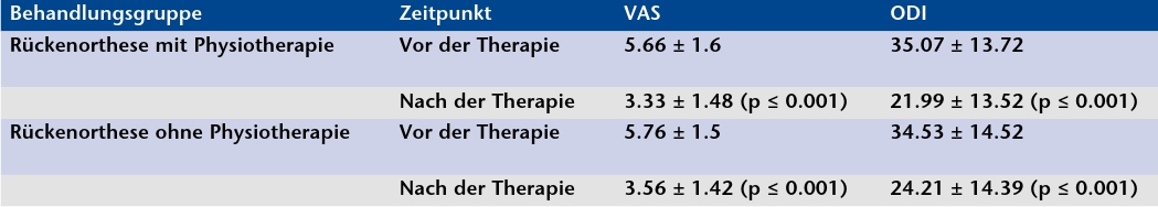 Die Auswertung der erhobenen Daten, unterteilt in zwei Behandlungsgruppen (Rückenorthese mit Physiotherapie, Rückenorthese ohne Physiotherapie), ergab, dass in den einzelnen Gruppen sowohl eine signifikante Reduktion des VAS als auch eine signifikante Verbesserung der Lebensqualität erzielt werden konnte (Tab. 1, Abb. 3).