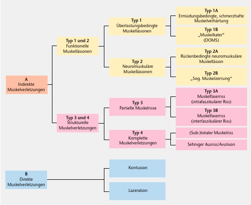 Die Terminologie bezüglich der Muskelverletzungen war bisher nicht standardisiert. Die Arbeitsgruppe um Müller-Wohlfahrt hat im Rahmen einer Consensus-Konferenz 2011 einen Klassifikationsvorschlag erarbeitet, der 2013 veröffentlicht wurde 1 (Abb. 1).
